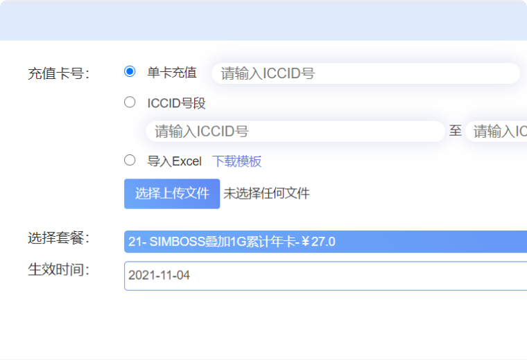 充值:折扣券付费、后台批量充值、单卡充值、微